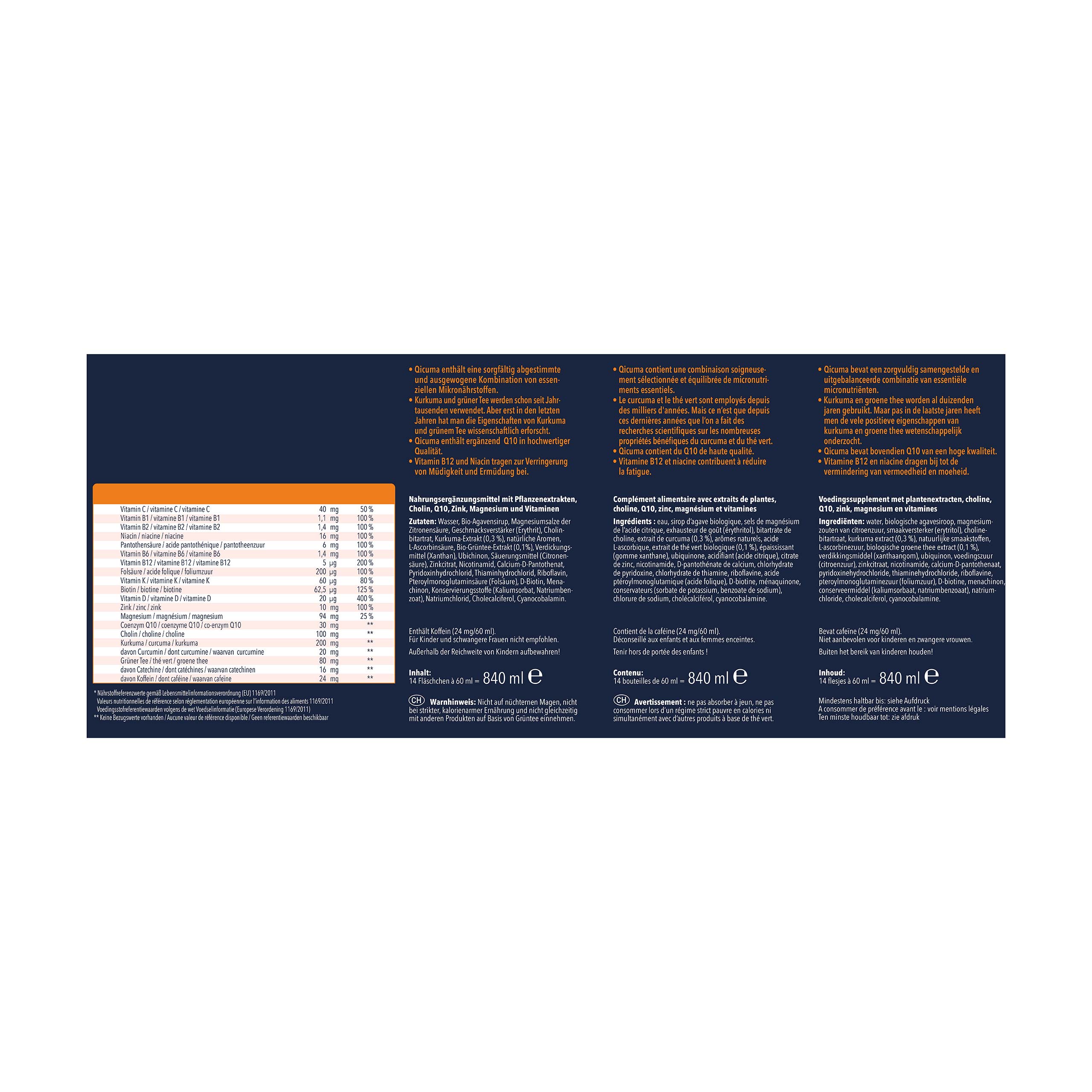 Zutaten: Wasser, Bio-Agavensirup, Magnesiumsalze der Zitronensäure, Geschmacksverstärker (Erythrit), Cholinbitartrat, Kurkuma-Extrakt (0,3 %), natürliche Aromen, L-Ascorbinsäure, Bio-Grüntee-Extrakt (0,1%), Verdickungsmittel (Xanthan), Ubichinon, Säuerungsmittel (Citronensäure), Zinkcitrat, Nicotinamid, Calcium-D-pantothenat, Pyridoxinhydrochlorid, Thiaminhydrochlorid, Riboflavin, Pteroylmonoglutaminsäure (Folsäure), D-Biotin, Menachinon, Konservierungsstoffe (Kaliumsorbat, Natriumbenzoat), Natriumchlorid, Cholecalciferol, Cyanocobalamin.